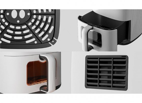 سرخ کن بدون روغن (هوا پز) از طراحی مینیمال با رنگ سفید و بدنهای ساخته شده از جنس پلاستیک ABS بهره میبرد. این محصول با فرم فاکتور استوانهای طراحی شده و در زیر هواپز چهار پایه با پدهای ضدلغزش قرار دارد که امکان قرارگیری هواپز بر روی انواع سطوح صاف را میسر میکند.